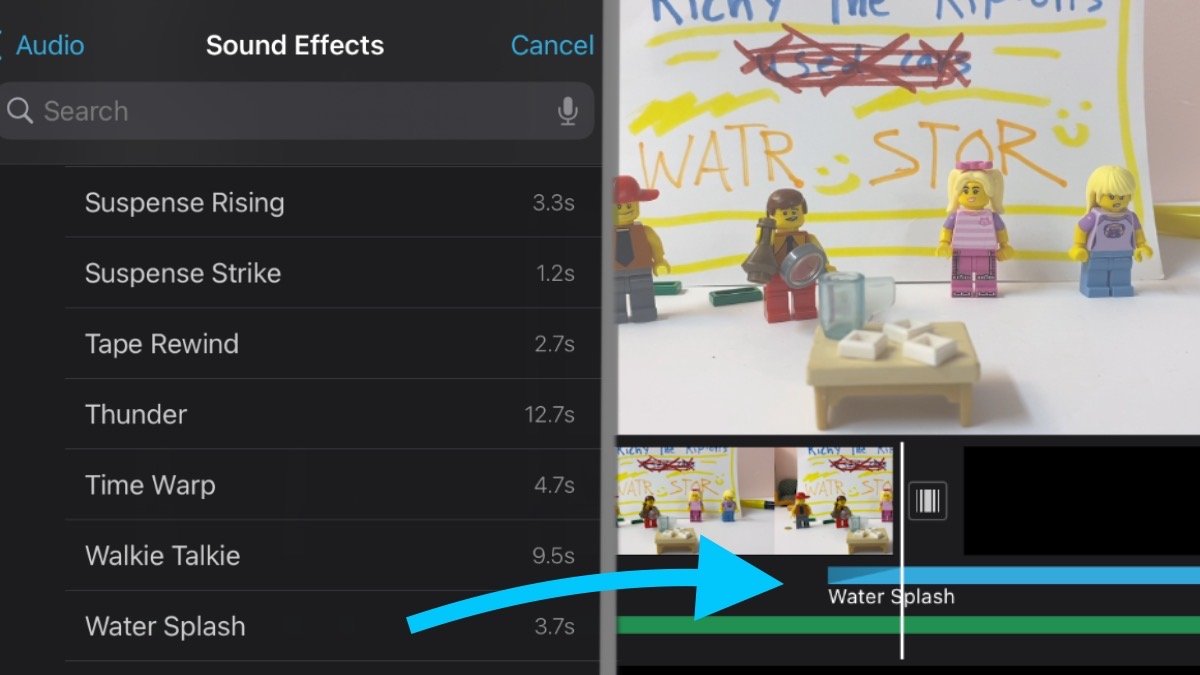 My program comes with all sorts of sound effects, from an alarm to a watersplash. I use this feature whenever I can’t achieve the correct sound in the filming process, like a door closing or footsteps on the ground. I only add a sound effect if it will help draw attention to the character making the sound and accentuate the action. If the object and the sound don’t go well together, then it would be better to not add a sound effect at all.