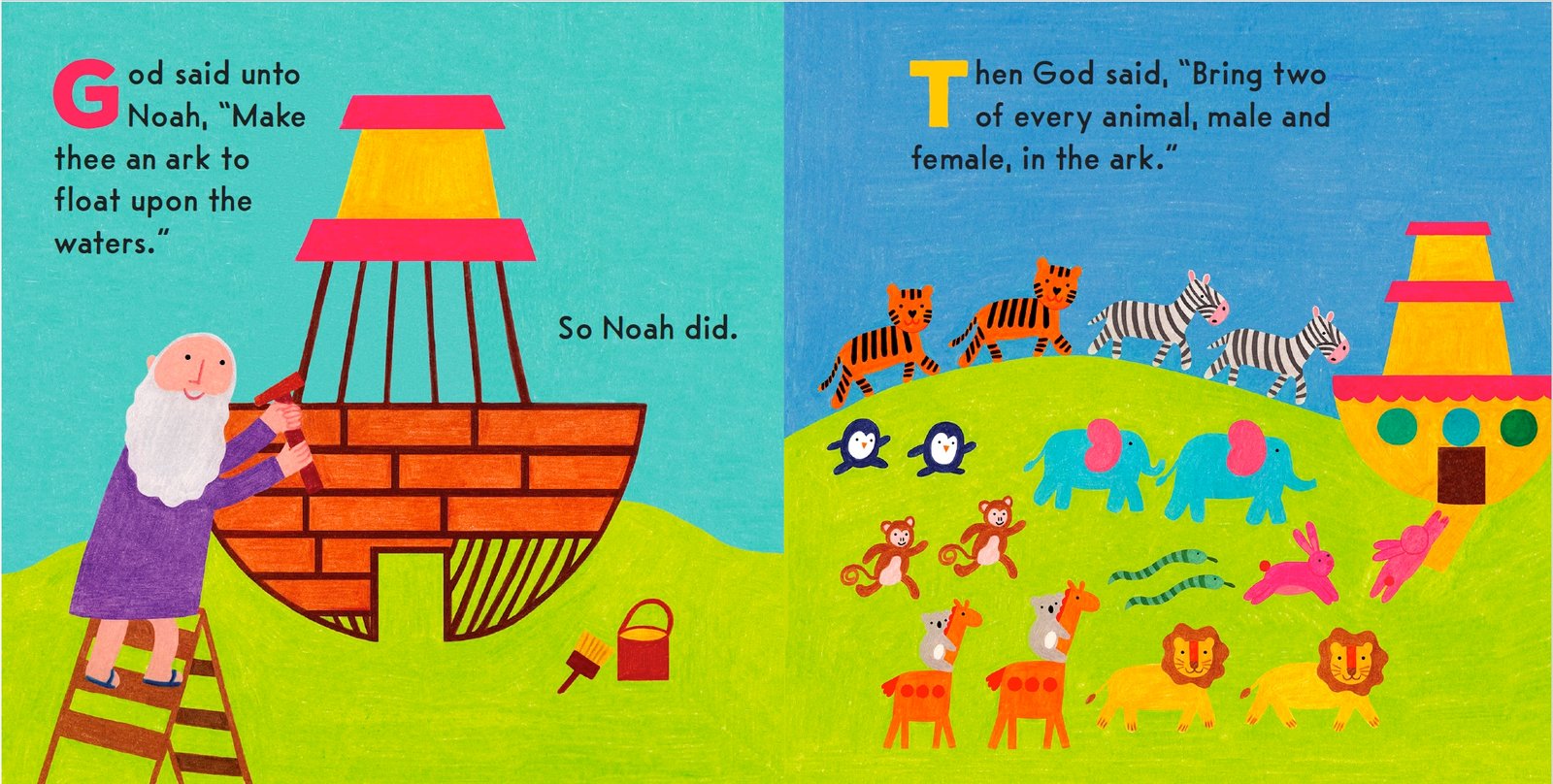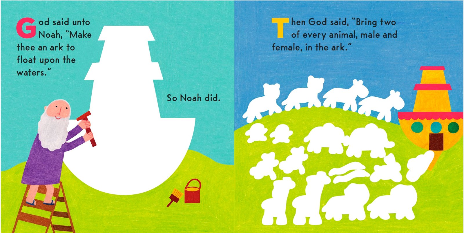 These Bible stories are simple retellings. In Noah’s Ark, the ark, the flood, the dove, the rainbow, and more appear, carefully telling the story of Noah. In The Creation, the earth, water, animals, and more magically appear, carefully chronicling the six days of creation. Both stories are from the book of Genesis.