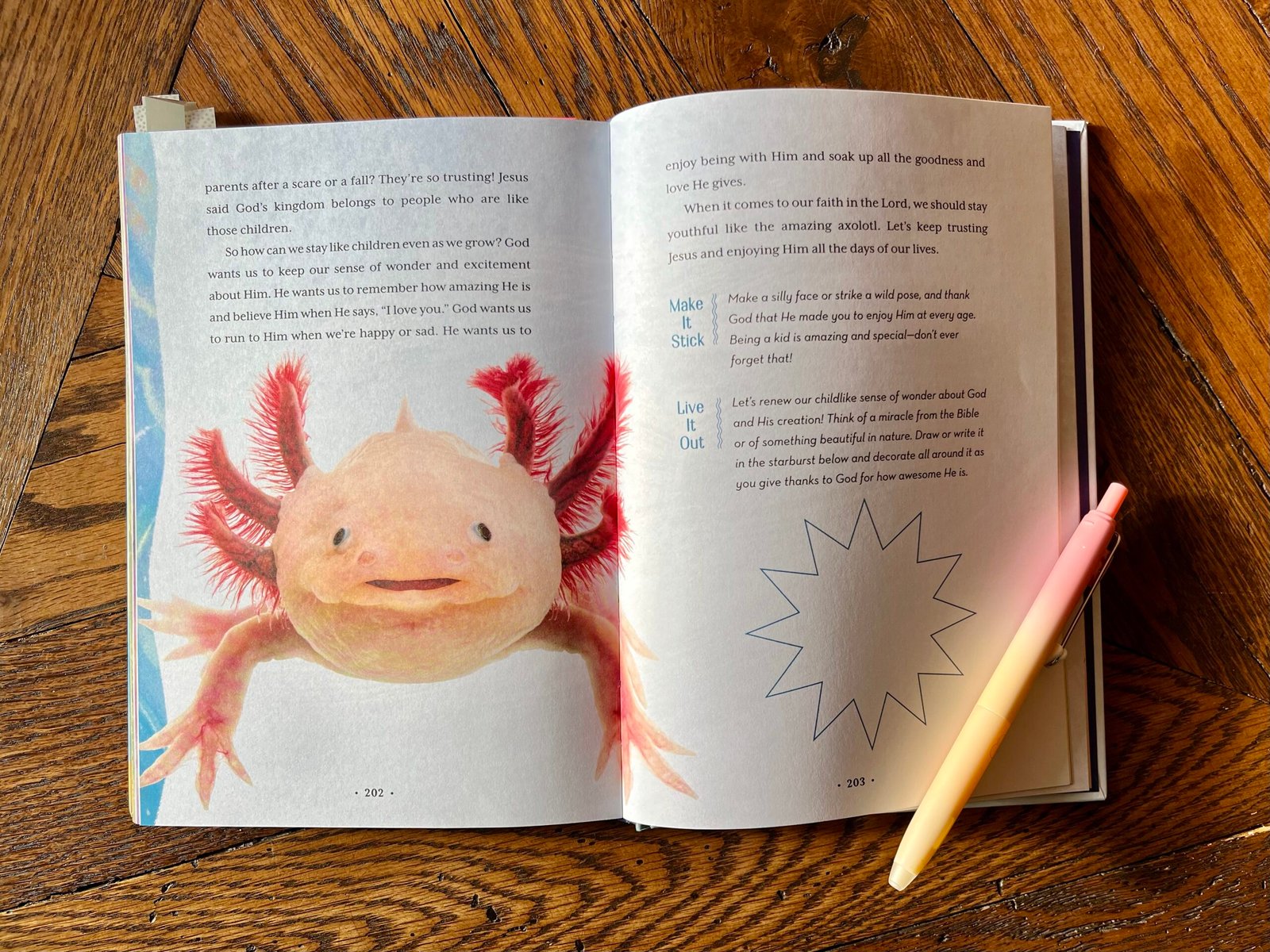Valerie: I discovered so many animals I wasn’t even aware of like the arapaima and the decorator crab, but one that continues to amaze me is a favorite of many kids: the axolotl. In the book, I focus on how this amphibian doesn’t go through metamorphosis! The way it keeps its youthful characteristics its whole life can remind us that Jesus wants us to keep our childlike faith in Him, no matter how much we grow.