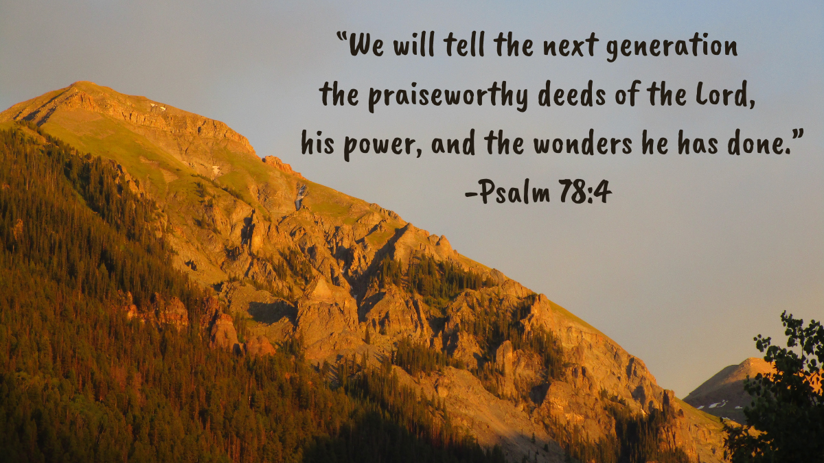 In Psalm 78, Asaph, the chief musician in the time of David, urges Israel to tell the next generation of the wonderful works of the Lord. He emphasizes the importance of preserving and sharing Israel’s history with her children. Why does he say that it’s so important to share God’s works? So that “they [the next generation] would put their trust in God and would not forget his deeds but would keep his commands,” (Psalm 78:7).