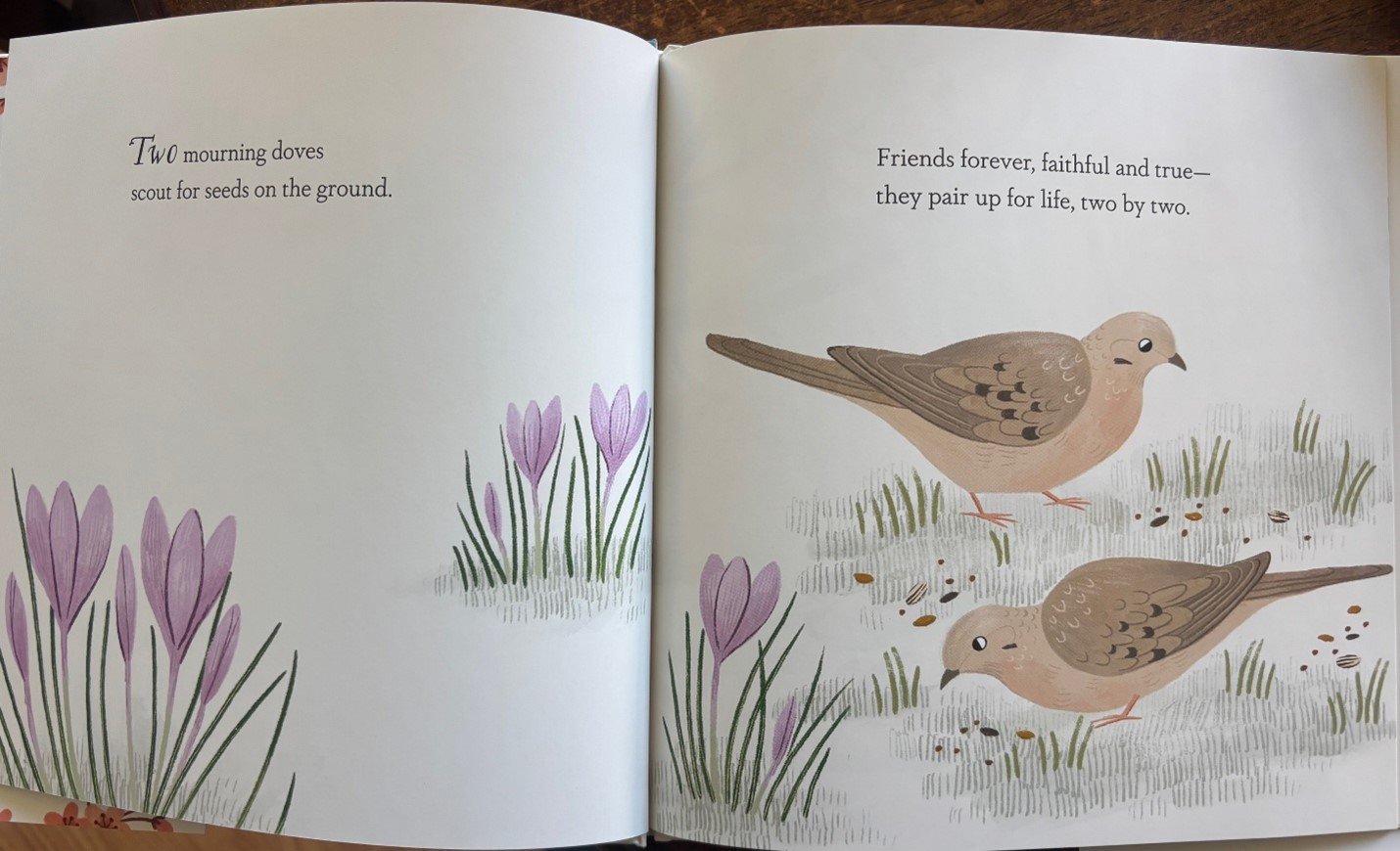 Two mourning doves scout for seeds on the ground. Friends forever, faithful and true—they pair up for life, two by two.”