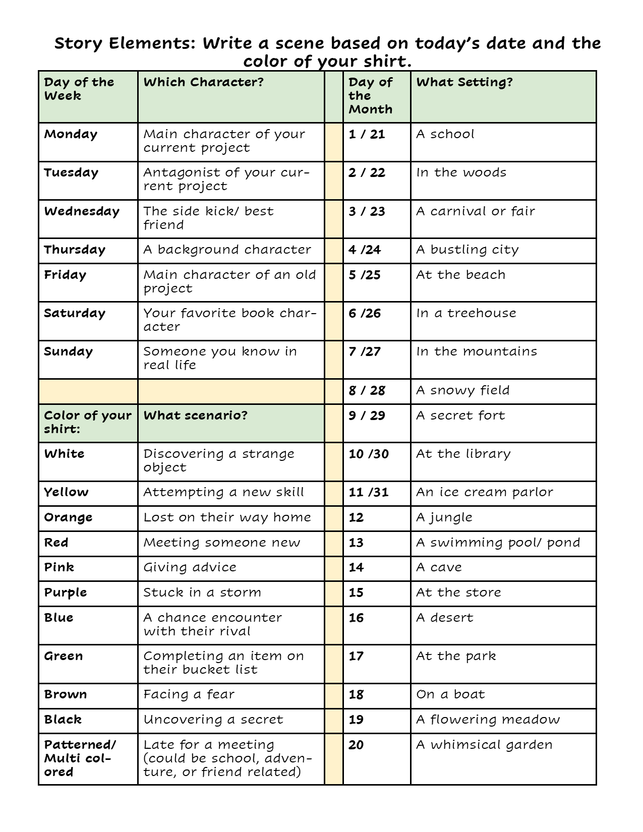 Write a scene using the chart below to choose who, what, and where you'll write about, based on the day's date and the color of your shirt. This can be a fun way to mix-and-match elements while still having a bit of structure. Or create your own chart based on the characters, places, and topics you usually like to focus on as a guide for days when you need ideas.