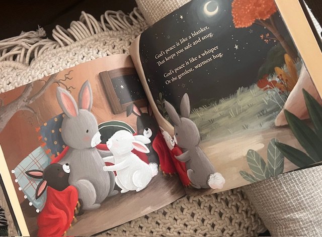 The illustrations are breathtaking. Cozy woodland scenes with mice nestled in their nest, an otter floating listlessly in the water holding her baby close, and snuggly raccoons — each page feels like a peaceful embrace. The rhyming text is gentle and calming, like a sweet lullaby. Although it’s tough to pick a favorite spread in the book, I think mine is the sweet family of bunnies with the beautiful words, “God’s peace is like a blanket, that keeps you safe and snug. God’s peace is like a whisper, or the gentlest, warmest hug.”