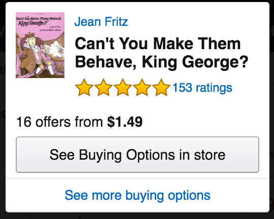 Jean Fritz. If you know her work, you'll be smiling at the mere mention of her name. Her humor has wooed and wowed millions of kids into learning American history. I want to be her when (if) I grow up. See that book below? You can get it for $1.49—what are you waiting for? Didn't you see all those 5-star reviews? This book (the one pictured below) is about King George and it deserves every single one of those stars. Did you know he had pigeon toes? You need to read this book to help you understand the American Revolution and pigeon toes. A book that can do both is rare indeed.