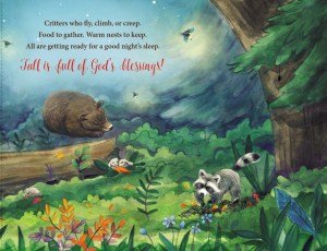 One of the first things I noticed about God's Blessings of Fall are the sounds which Jean included. "A squirrel steps lightly, slightly on crisp leaves. Crackle. Crunch. He snatches fallen acorns nuts, and stuffs them into his chubby cheeks. His little nose twitches. His bushy tail swishes. His tiny feet leap and scamper to the top of the tallest tree." Besides the onomatopoeia of the sounds of the leaves, do you hear the alliteration of chubby cheeks and tallest tree? How about the internal rhyme of lightly and slightly; twitches and swishes? Every spread includes one or more types of poetic language that will tickle the reader's tongue and will keep a young reader's attention.