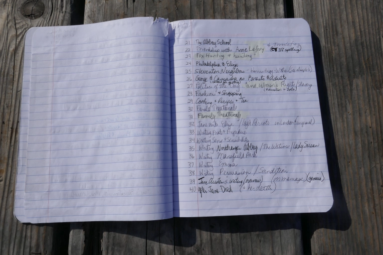 Now that my bibliography was typed and each research book had its own code, I made a page in my research notebook for these codes. I listed my first research book and its title. As I started to read that book, I created new pages in my notebook for each new topic I wanted to track: Jane Austen’s Father. Jane’s Mother. Jane’s Sister. Jane’s Brothers. Steventon, where she was born.