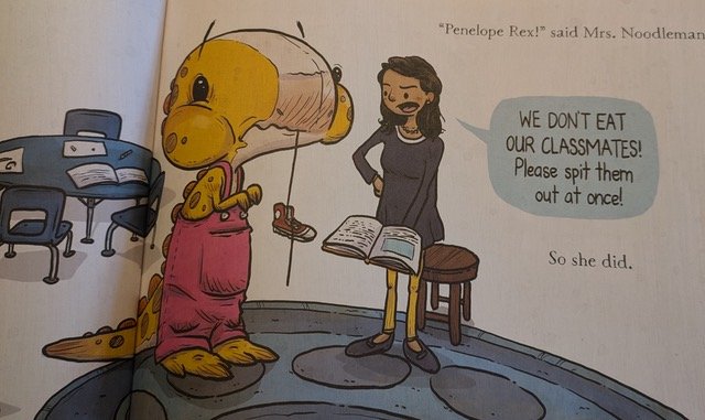Then Penelope notices no one wants to play with her. She goes home sad, because she didn’t make any friends. When she laments this to her father, he asks, “Penelope Rex, did you eat your classmates?”